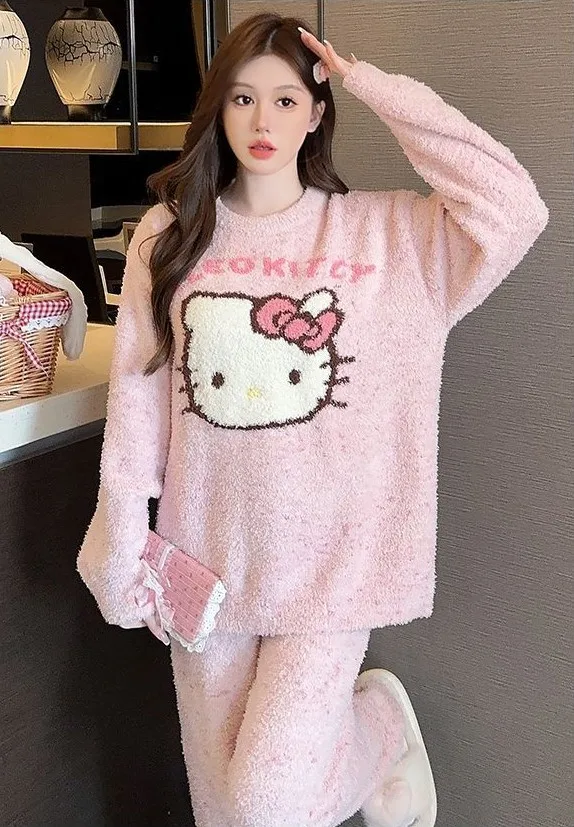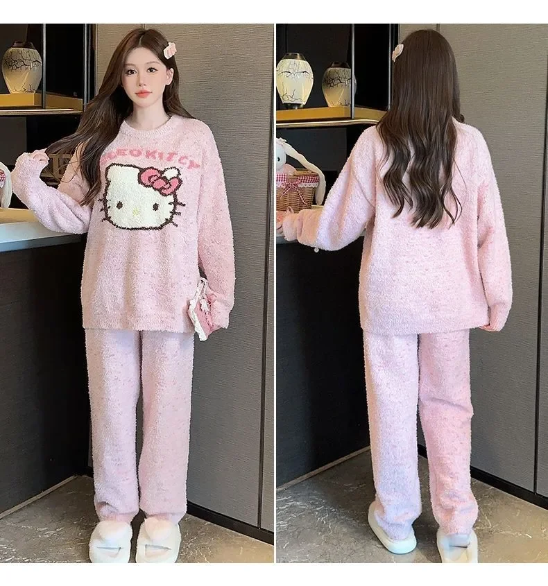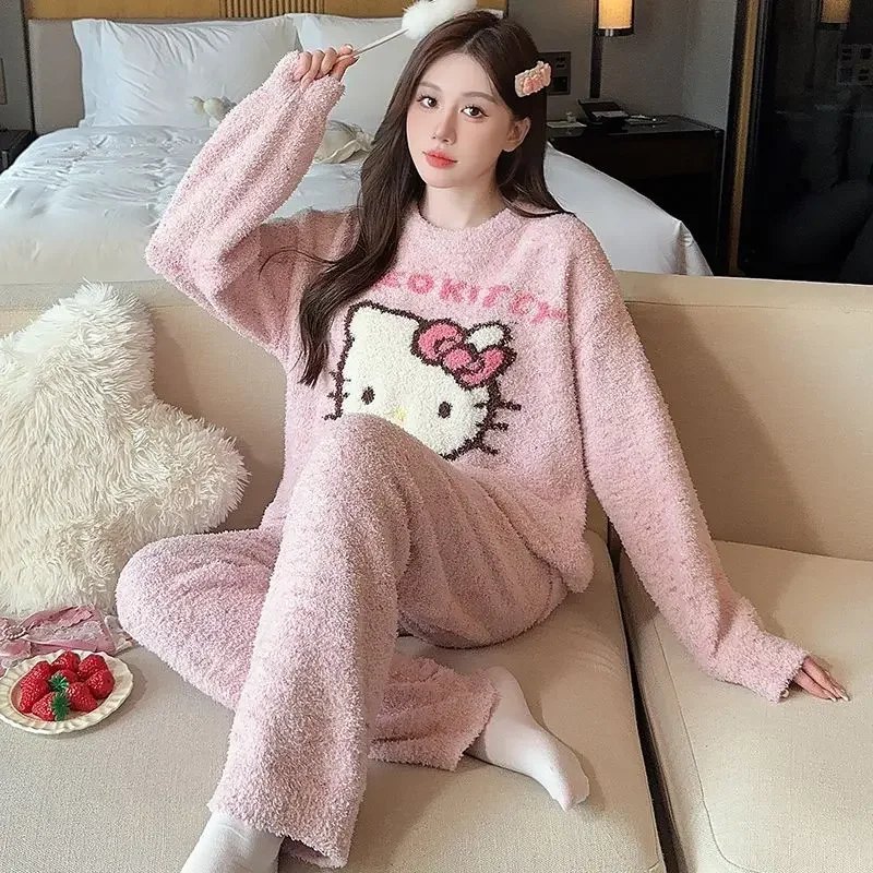 Hello Kitty Women's Fall Winter Coral Fleece Plush Pajama Set Soft Fluffy Cozy Sleepwear & Home Loungewear