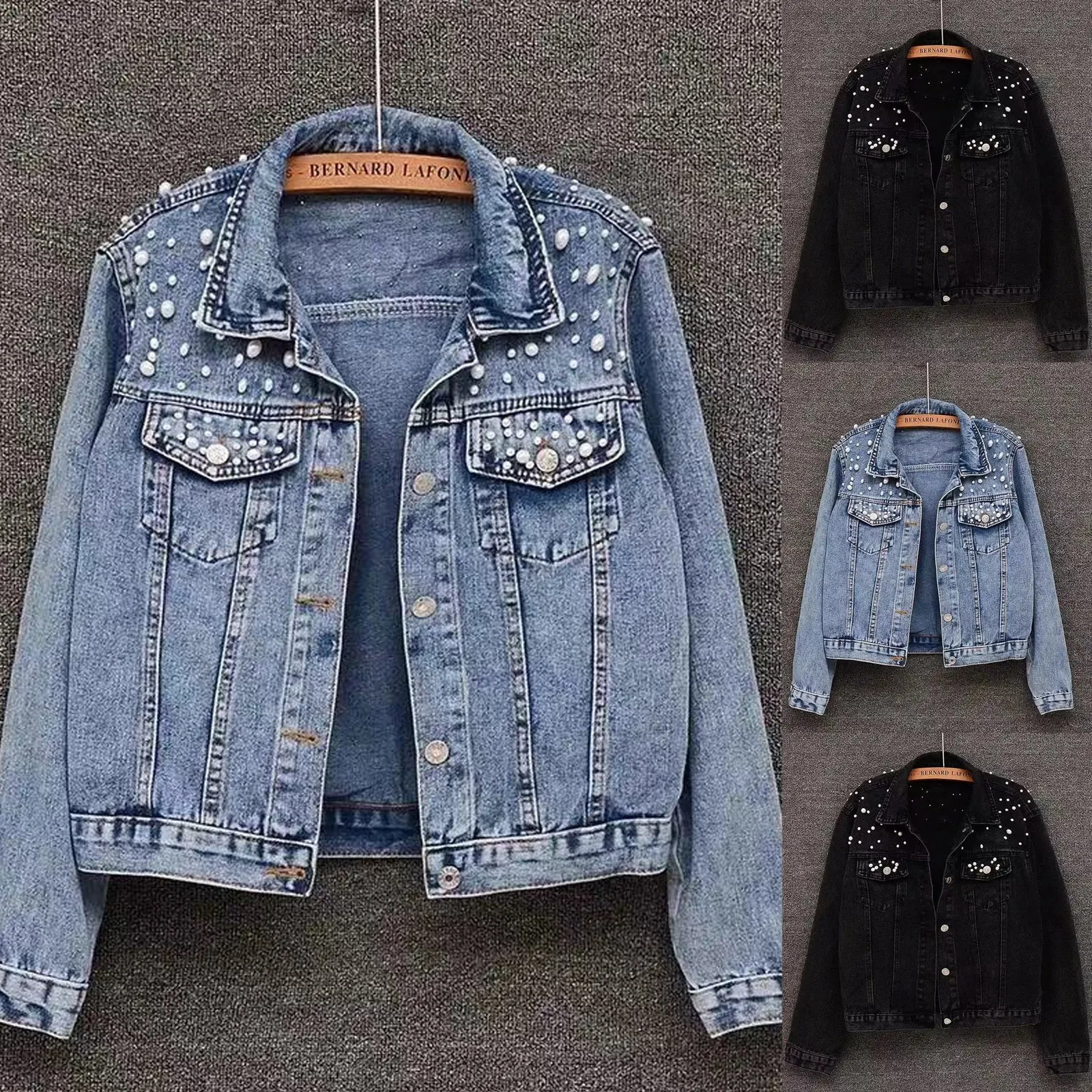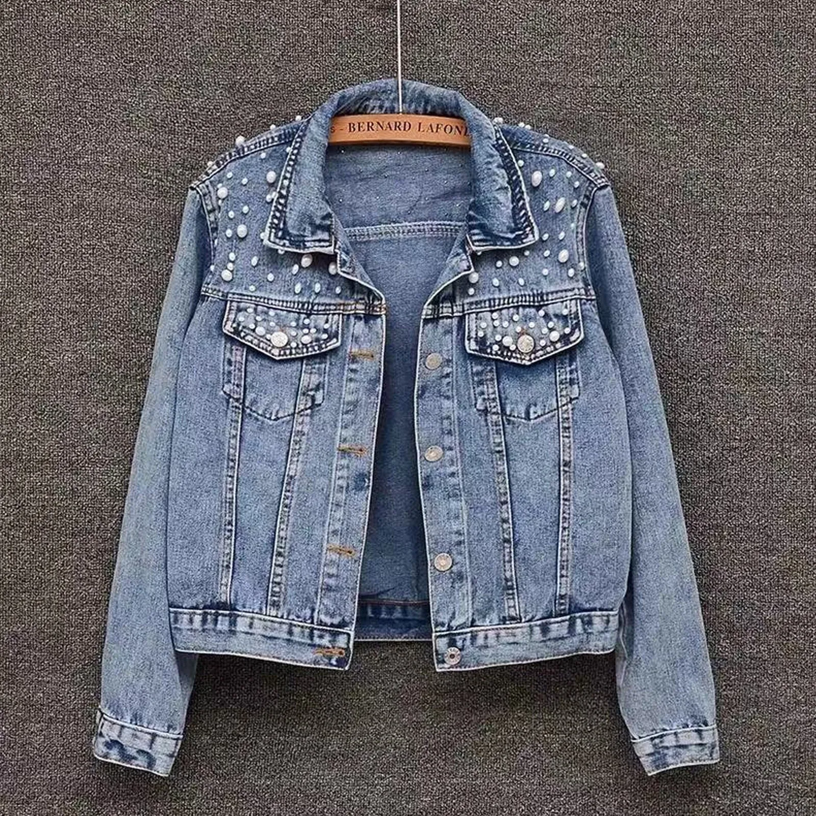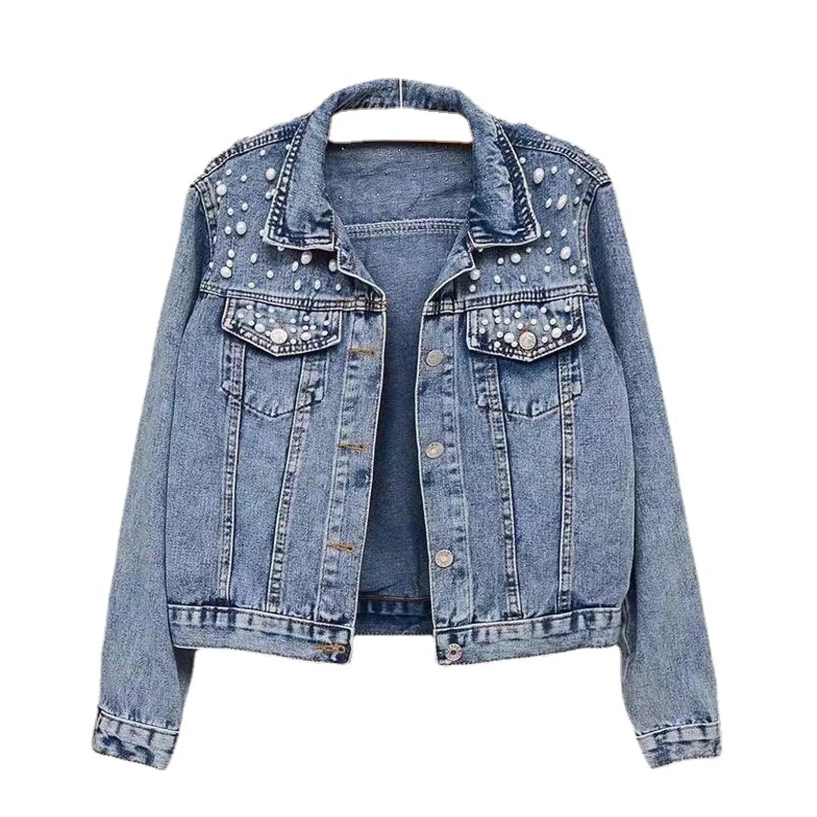Women's Large Denim Jacket Embroidered Pearl Beaded Denim Jacket Coat