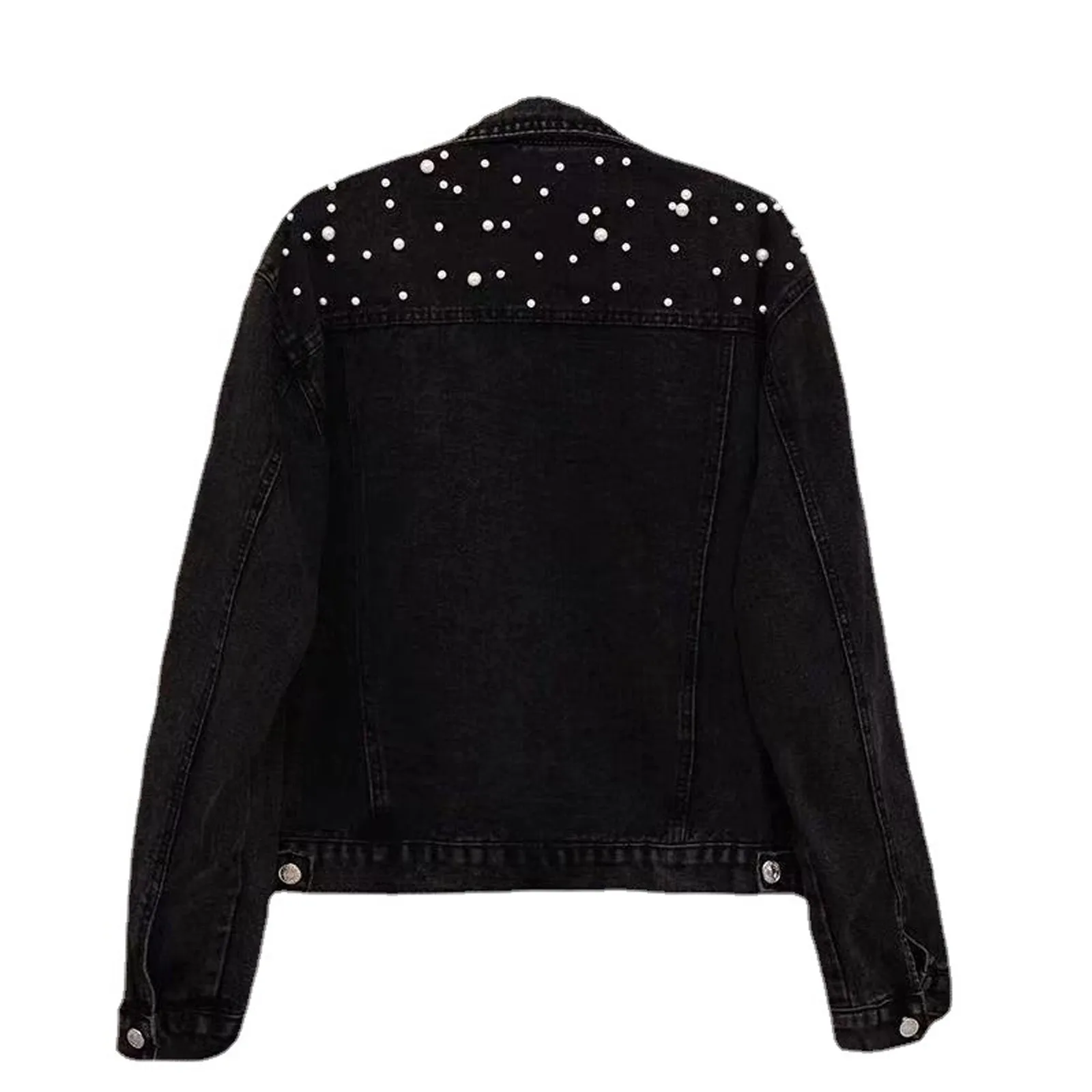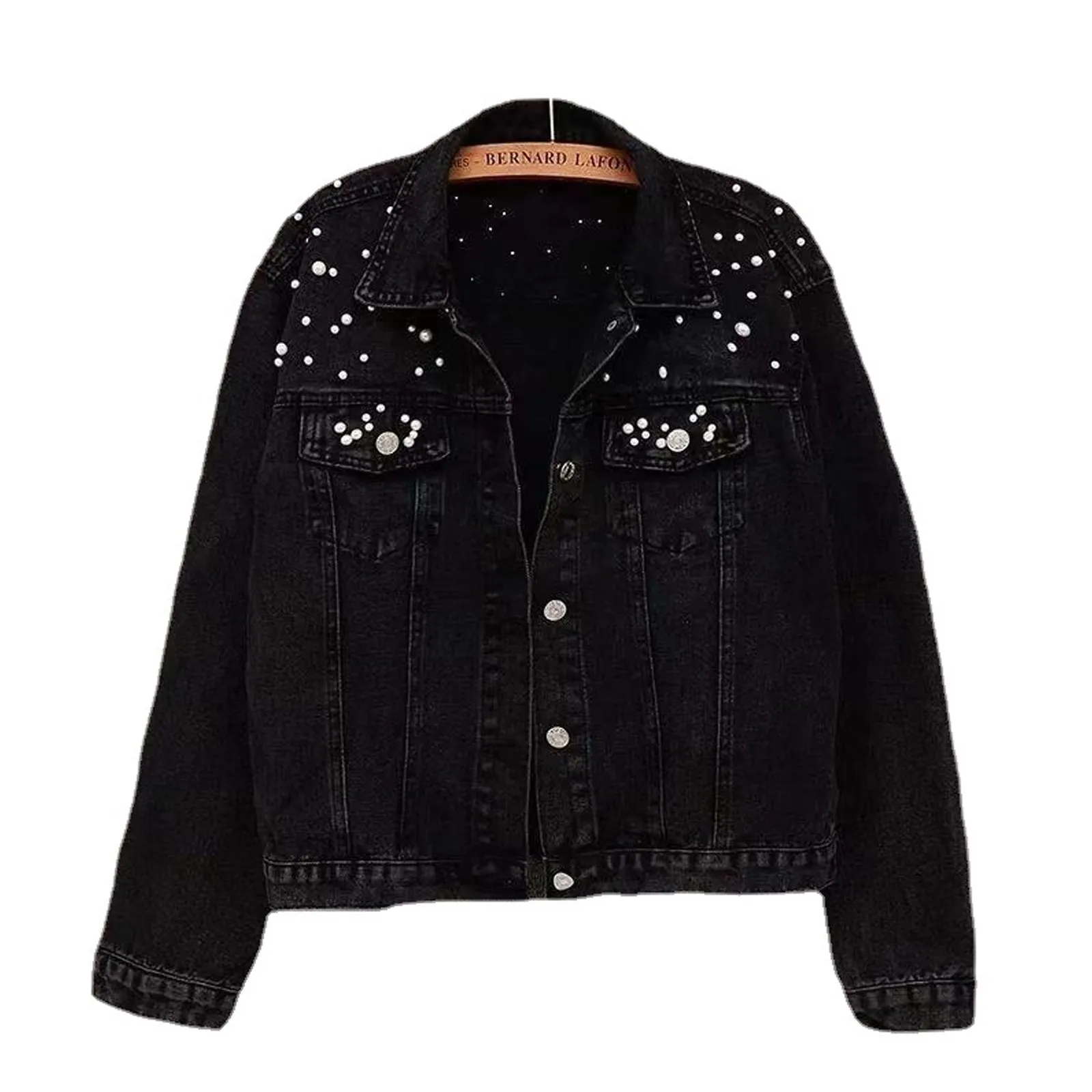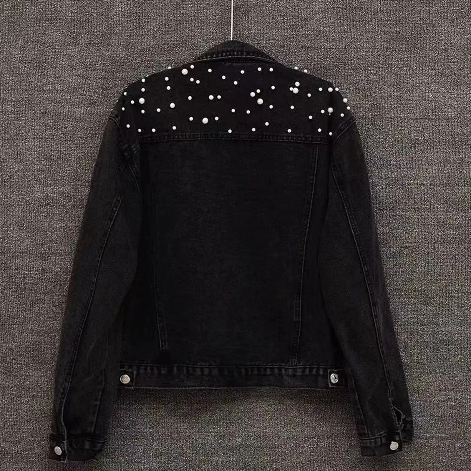 Women's Large Denim Jacket Embroidered Pearl Beaded Denim Jacket Coat