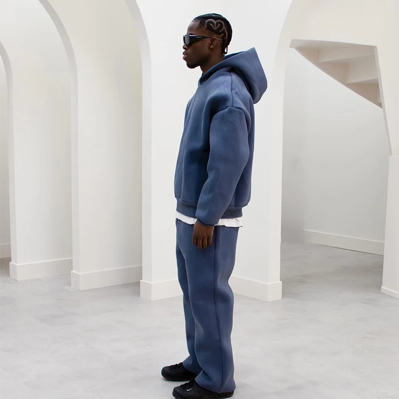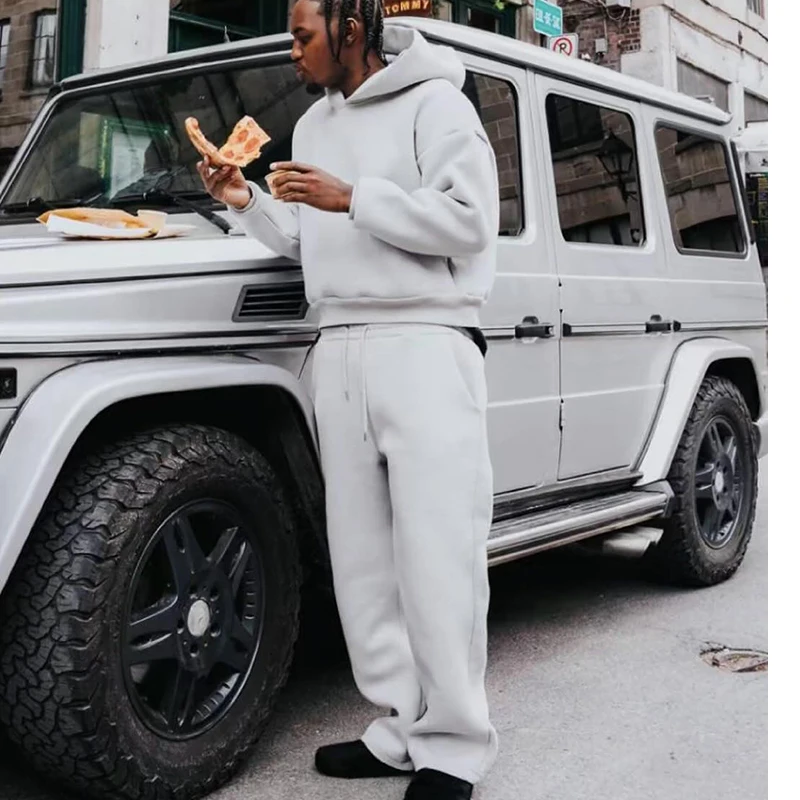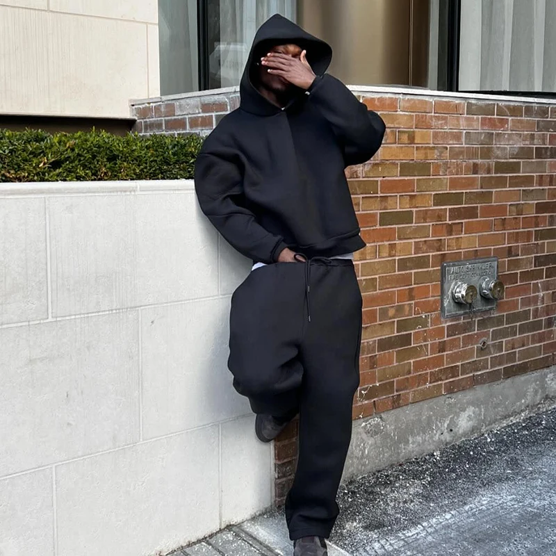 Men's Casual Solid Hooded Pullover Straight Pants 2 Piece Set Tracksuit For Fashion Loose Hoodies Sweatshirt Wide Leg Sweatpants